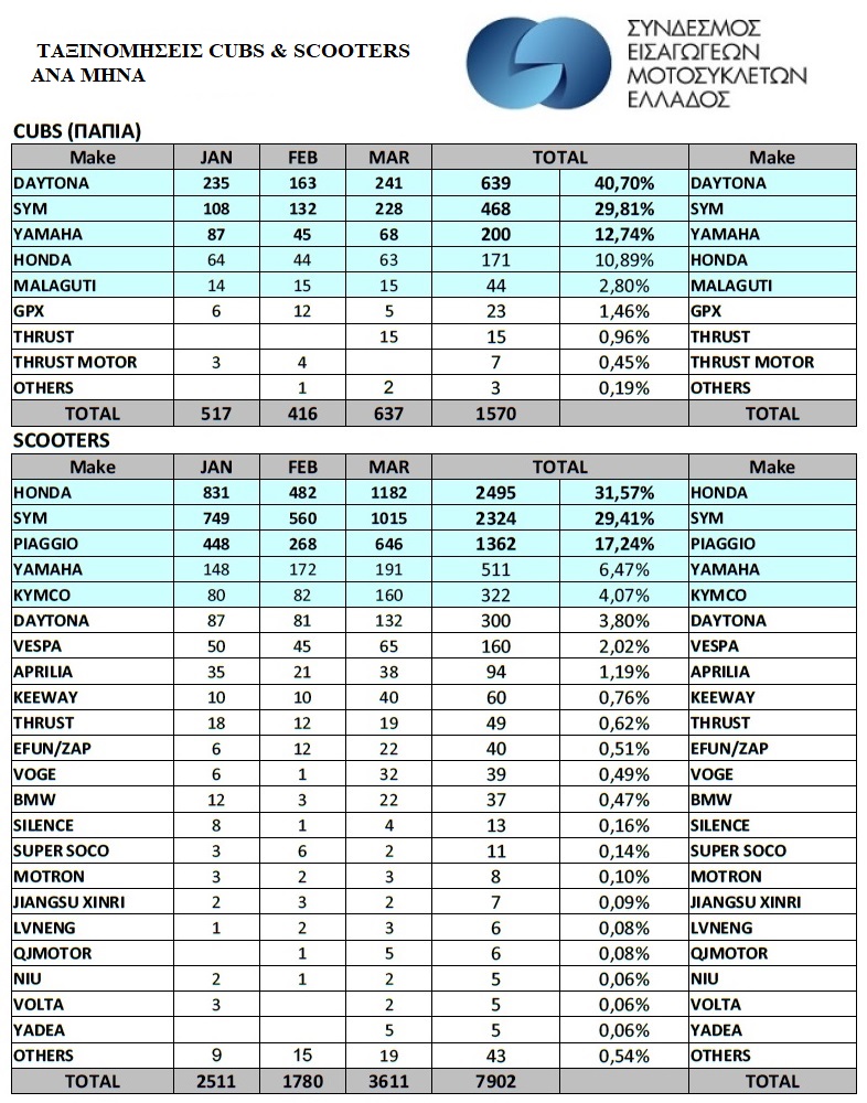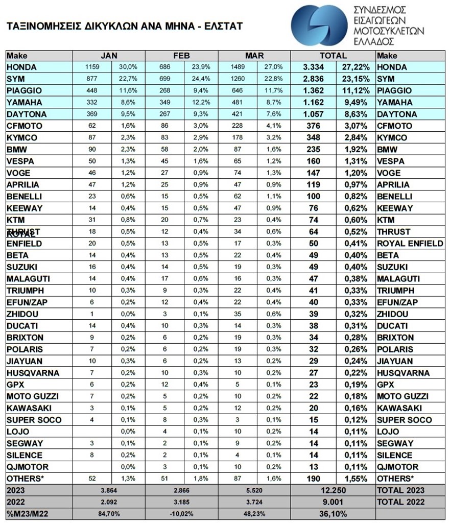 Σε ότι αφορά τις ταξινομήσεις ανά μάρκα τις πέντε πρώτες θέσεις στον πίνακα καταλαμβάνουν οι ίδιες εταιρείες που είχαν τις πέντε πρώτες θέσεις και το 2022. Η Honda είναι στην 1η θέση με 3.334 ταξινομήσεις με την SYM στη 2η θέση με 2.836 ταξινομήσεις και την Piaggio τρίτη με 1.362 ταξινομήσεις. Aκολουθούν η Yamaha με 1.162 και η Daytona κλείνει την πεντάδα με 1.057 ταξινομήσεις. Αξίζει εδώ να αναφέρουμε ότι η CFMOTO έχει ανέβει στην 5η θέση χάρη και στις πολύ καλές πωλήσεις του CFORCE 450, ενώ και η QJ MOTOR άρχισε ήδη να εμφανίζει ταξινομήσεις παρά το γεγονός ότι ουσιαστικά μόλις τον Μάρτιο ξεκίνησε η αντιπροσωπεία να παραλαμβάνει τα πρώτα δείγματα μοτοσυκλετών.