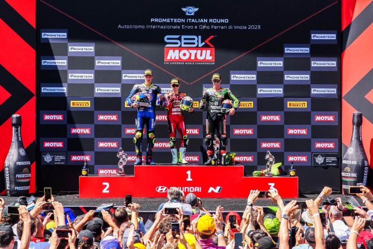 Ο Alvaro Bautista της Aruba.it Racing – Ducati επέδειξε την κυριαρχία του στον πρώτο αγώνα WorldSBK στην Imola, κλείνοντας την 17η νίκη του στη σεζόν και πλησιάζοντας το ρεκόρ για τις περισσότερες νίκες. Στον αγώνας έγινε μια συναρπαστική μάχη, με τον Bautista να βγαίνει νικητής μπροστά από τον Toprak Razgatlioglu (Pata Yamaha Prometeon WorldSBK), ο οποίος πανηγύρισε το 100ο του βάθρο στο WorldSBK και επέκτεινε το εντυπωσιακό σερί 16 διαδοχικών τερματισμών στο βάθρο. Ο Jonathan Rea (Kawasaki Racing Team WorldSBK) εξασφάλισε μια σταθερή τρίτη θέση, προσθέτοντας περαιτέρω στην εκτενή συλλογή του 252 βάθρα καριέρας.