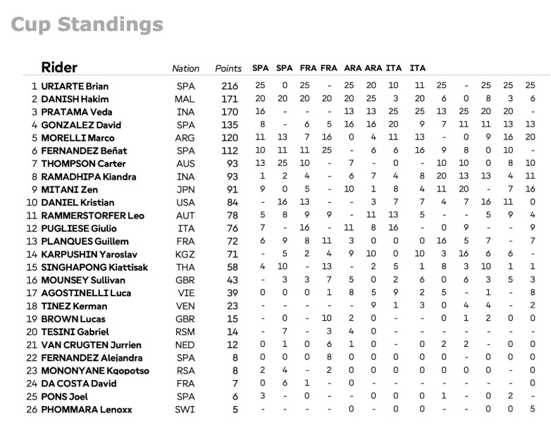 Ο Uriarte μπήκε στον προτελευταίο Αγώνα της 19ης σεζόν του Κυπέλλου ως πρωτοπόρος στη βαθμολογία, μπροστά από τους Veda Pratama και Hakim Danish. Όταν ο Pratama συγκρούστηκε με τον Yaroslav Karpushin και έπεσε στον 11ο από τους 15 γύρους, παρασύροντας και τον Danish εκτός πίστας, το Κύπελλο ουσιαστικά κατέληξε στον Uriarte.