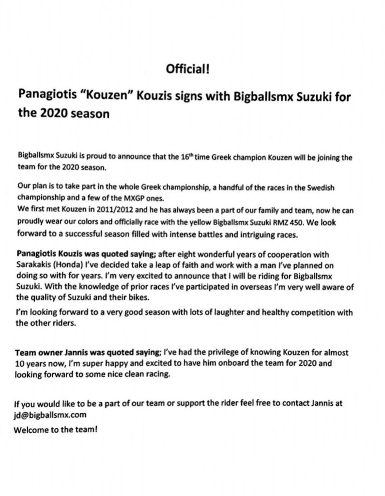 Η ομάδα Bigballsmx Suzuki βρίσκεται στην ευχάριστη θέση να ανακοινώσει τη συνεργασία με τον 16 φορές Έλληνα πρωταθλητή του motocross, Παναγιώτη Κουζή, για το 2020.
