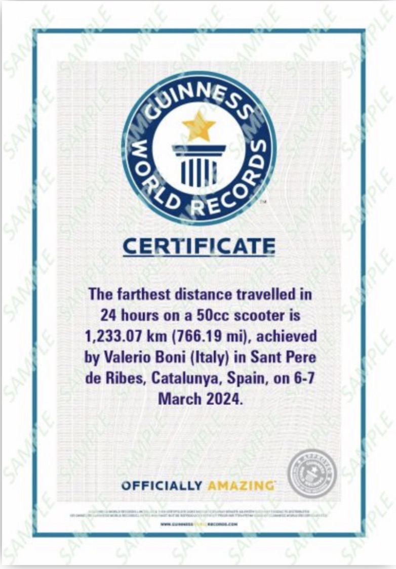 Ένα νέο ρεκόρ, το έκτο μέσα σε τρία χρόνια, προστίθεται στη μοναδική συλλογή του Valerio Boni, ενός 65χρονου δημοσιογράφου που ειδικεύεται στους κινητήρες, ειδικά στους μικρούς κυβισμούς. Το τελευταίο της σειράς είναι αυτό που με 1,233.075 χλμ. (766.19 μίλια), ορίζει τη μέγιστη απόσταση που διανύθηκε σε 24 ώρες με ένα σκούτερ 50 κυβικών, που κατακτήθηκε από το μεσημέρι της 6ης Μαρτίου έως την ίδια ώρα την επόμενη μέρα στην ιστορική πίστα Terramar, περίπου σαράντα χιλιόμετρα νότια της Βαρκελώνης. Ένα αποτέλεσμα που όχι μόνο ανεβάζει τον πήχη του ρεκόρ κατά 305 χλμ. αλλά αντιπροσωπεύει και προσωπική ικανοποίηση για το ότι επανέλαβε και ξεπέρασε ό,τι είχε γίνει πριν από 45 χρόνια.