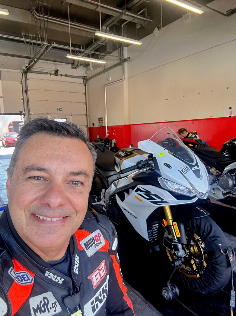 Λίγο αργότερα ο Rivola μου πρόσφερε τη δική του RS660 Trofeo και εκείνος με ακολούθησε με την “απλή” Extrema. H Τrofeo με μόλις 153 κιλά και με αγωνιστικά ηλεκτρονικά και απόδοση 105 ίππους, αλλά και με πιο αγωνιστική θέση οδήγησης, με τα κλιπ-ονς πιο χαμηλά και τα μπαρσπιέ πιο ψηλά, ήταν το απόλυτο παιχνίδι της ημέρας πάνω στα Pirelli Supercorsa V4 SC1. Η αίσθηση στο πλάγιασμα στην είσοδο της στροφής ήταν εκπληκτική, μέσα στη στροφή η πρόσφυση σου έδινε τρομερή σιγουριά και στην έξοδο της στροφής τα πάντα εξελισσόταν ομαλά. Το 20λεπτο πέρασε χωρίς καθόλου κούραση και με τρομερή δόση ευχαρίστησης στην οδήγηση, παρά το ότι δεν είχαμε την τρομερή ώθηση που σου δίνουν οι 217 ίπποι της RSV4 και το δέος του να πλησιάζεις την Curvone (την πιο γρήγορη στροφή της πίστας) με 240 χλμ/ώρα.