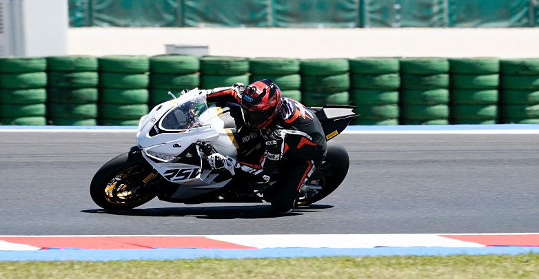 Μπήκα λοιπόν στην πίστα αρχικά με την RS660 Extrema των 100 ίππων για να ανακαλύψω και στο Μιζάνο – την είχαμε οδηγήσει και στις Σέρρες πέρυσι – ότι η μεσαία μοτοσυκλέτα της Aprilia είναι ένα θαυμάσιο παιχνίδι σούπερσπορ οδήγησης που δεν σε κουράζει με τα μόλις 166 κιλά της (άδεια) και δεν σε φοβίζει με το άνοιγμα του γκαζιού, με τους 100 ίππους να την ωθούν ομαλά προς την έξοδο της στροφής. Με μια τέτοια μοτοσυκλέτα χωρίς καμία μετατροπή στην ίδια πίστα ο Miguel Oliveira, οδηγός της μάρκας στο MotoGP, έγραψε το φοβερό χρόνο του 1’45”467 και όσοι είχαν την τύχη να κάνουν γύρους στο Misano μπορούν να καταλάβουν το τι σημαίνει αυτός ο χρόνος.