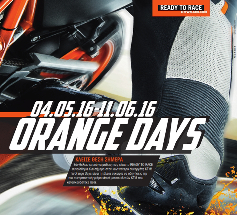Η δημοφιλής φίρμα ανακοίνωσε ότι από τις 4 Μαΐου έως τις 11 Ιουνίου, θα πραγματοποιήσει σε συνεργασία με το δίκτυο της τα Orange Days 2016, δίνοντας τη δυνατότητα στους φίλους της για μια απολαυστική δοκιμαστική διαδρομή με την αγαπημένη τους μοτοσικλέτα.