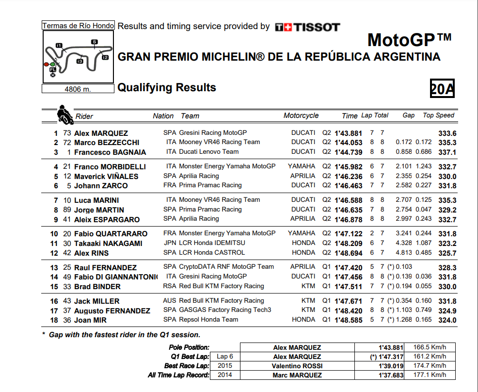 H βροχή είχε κάνει την εμφάνισή της κατά την αρχή των κατατακτήριων των MotoGP στην Αργεντινή. Τα βρόχινα ελαστικά ήταν η προφανής επιλογή όλων κατά τις ΚΑΤ1, με τους Alex Marquez και Jack Miller να είναι στις πρώτες 2 θέσεις που οδηγούν στις ΚΑΤ2 μετά τα πρώτα περάσματα. Ο Marquez μάλιστα κατέβασε τον χρόνο του περαιτέρω, με τον Fabio Di Giannantonio να περνά στη δεύτερη θέση και να κάνει το 1-2 για την Gresini Ducati.