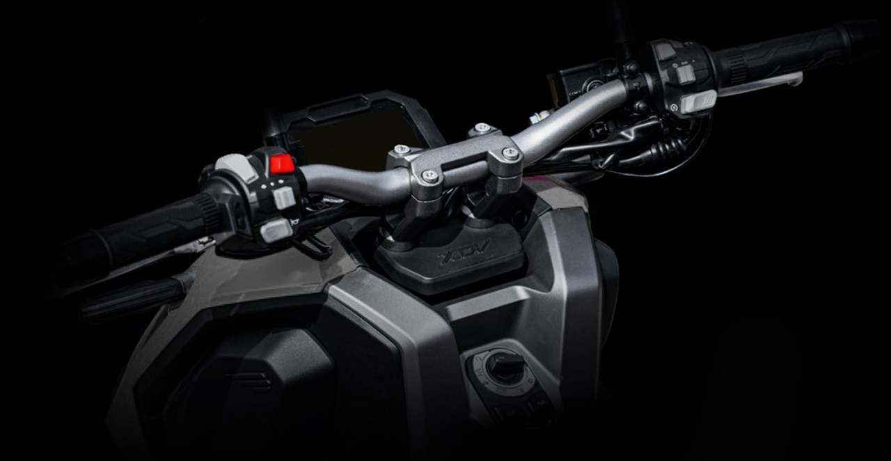 Το ξεχωριστό τιμόνι του είναι αλουμινένιο μεταβλητής διαδρομής και εδράζεται σε επίσης αλουμινένια καβαλέτα, ακολουθώντας τα μοτοσυκλετιστικά πρότυπα. Το πλάτος του προσφέρει έναν ικανοποιητικό μοχλό, που συμβάλλει τα μέγιστα στη διατήρηση του ελέγχου ακόμη και σε δύσκολα τερέν.