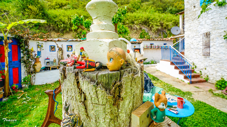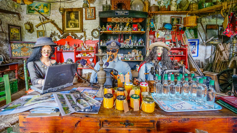 Το ζευγάρι αυτό από σκουπίδια έφτιαξε ένα καφενείο παντοπωλείο για να ζουν οι κούκλες τους. Κούκλες βιτρίνας που μοιάζουν πραγματικά με κατοίκους και επισκέπτες του χωριού, οι οποίοι κάθονται κάτω από κληματαριά, πάνω στο μπαλκόνι και μέσα στο οίκημα. Αυτό το σπίτι-μουσείο είναι ένα διώροφο, το οποίο στην κυριολεξία είναι γεμάτο με σκουπίδια σωσμένα από κάδους, ένας λαογραφικός θησαυρός τραβηγμένος από τη φθορά και την απαξίωση των σκουπιδιών. Πατίνια, σαμάρια, ταμπέλες, παλιά τηλέφωνα, φισούνες, κούνιες, κασέλες, μπαούλα, μπουκάλια, βαρέλια, σκάφες, παλιά παιχνίδια, ρόδες από κάρα, τηλεοράσεις, laptop, ραδιόφωνα, παλιές καρέκλες, γιαταγάνια και κορνίζες με παλιές φωτογραφίες άλλων εποχών, εργαλεία αλλά και τραπέζια, α, έχει και σπιτικές μαρμελάδες. Όλα αυτά είναι στριμωγμένα σε δύο ορόφους και εδώ δημιουργείται ένα πάντρεμα, της απόλυτης μαγείας θα λέγαμε, έτσι η πρόκληση πρόσκληση για τον επισκέπτη να τα γνωρίσει είναι ιδιαίτερη. Όλα αυτά που ήταν πεταμένα στη λήθη των σκουπιδιών βρήκαν στέγη εδώ.