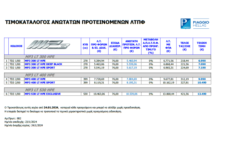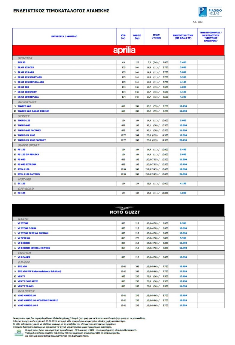 Tιμοκατάλογοι λιανικής της Piaggio Hellas, για τα εμπορικά σήματα Piaggio, Vespa, Aprilia, Moto Guzzi