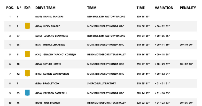 Στη Monster Energy Honda HRC, ο Ricky Brabec δείχνει αξιοσημείωτη σταθερότητα, σε βαθμό που μπορεί πλέον να θεωρείται ακόμη και επικεφαλής της ομάδας, έπειτα από το σοβαρό λάθος του Tosha Schareina. Ο Ισπανός κινήθηκε ανταγωνιστικά στην Ειδική, όμως δέχθηκε ποινή 10 λεπτών επειδή ξέχασε να εξέλθει από το bivouac-καταφύγιο ανάμεσα στις σημαίες, ένα λάθος που μπορεί να χαρακτηριστεί τουλάχιστον αχρείαστο ή από κάποιους “χαζό”! Η παράβαση αυτή τον έριξε από το προσωρινό βάθρο στην 4η θέση, υποχρεώνοντάς τον πλέον να καλύψει ένα έλλειμμα περίπου δώδεκα λεπτών από τον Sanders, αν θέλει να διατηρήσει ελπίδες για τη συνολική νίκη. Ο Adrien Van Beveren, που ήδη είχε βιώσει δύσκολες ημέρες στη φετινή διοργάνωση, έφτασε σήμερα σε νέο χαμηλό, χάνοντας πάνω από μισή ώρα, εν μέρει επειδή ένα σύρμα μπλέχτηκε στον τροχό του μετά από 88 χιλιόμετρα. Όταν η τύχη σου γυρίζει την πλάτη, τα πράγματα μπορεί να πάνε πραγματικά στραβά…
