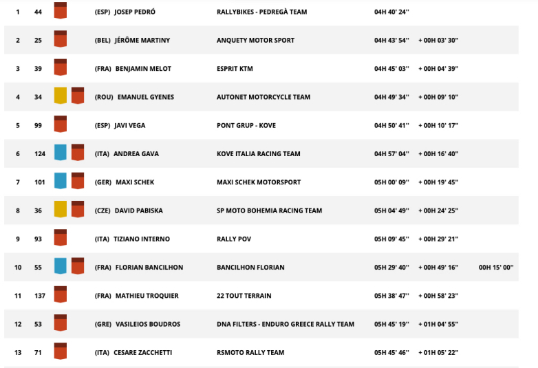 Στην κατηγορία Original by Motul, στην οποία διαγωνίζεται ο Έλληνας οδηγός κέρδισε πάλι ο Ισπανός Josep Pedro με Husqvarna, που παρέμεινε στην 2η θέση της Γενικής κατάταξης της κατηγορίας, τη στιγμή που στην πρώτη θέση από χθες πέρασε ο Γάλλος Benjamin Melot με ΚΤΜ. Η διαφορά τους είναι μόλις 1’27”.