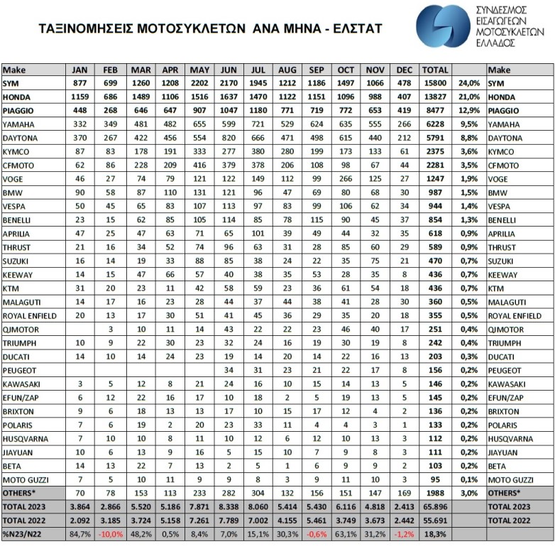 Με βάση τα στοιχεία ταξινομήσεων – πωλήσεων που ανακοινώνει ο ΣΕΜΕ  οι ταξινομήσεις – πωλήσεις το 2023 έφθασαν τα 65.896 δίκυκλα, όπως είχαμε προβλέψει, κάνοντας ρεκόρ πωλήσεων δεκαετίας.