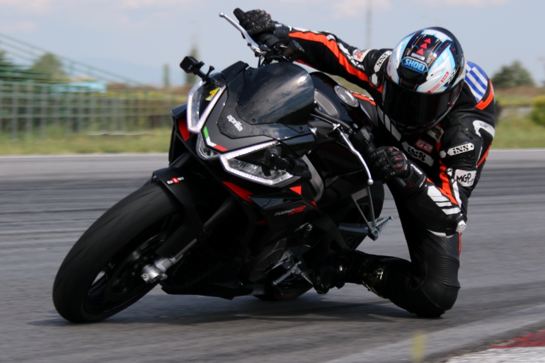Έχοντας στη διάθεσή μας τις δύο πολύ όμορφες Tuono 660 Factory και RS 660 Limited Edition, βρεθήκαμε κάτω από πολύ δύσκολες φθινοπωρινές συνθήκες στην πίστα των Σερρών, για να δοκιμάσουμε τις πολύ ιδιαίτερες αυτές μοτοσυκλέτες με το μικρό βάρος, να διαπιστώσουμε τη λειτουργικότητά τους αλλά και να τις συγκρίνουμε ως προς τις διαφορές τους. Με την αναμονή να μειωθεί η καταρρακτώδης βροχή και να μη χαθεί η πρώτη μέρα δοκιμών, ρυθμίσαμε με την πολύτιμη βοήθεια και εμπειρία του Κυριάκου Αντωνίου τις αναρτήσεις για να δουλέψουν σε βρόχινες συνθήκες. Σε αυτές τις συνθήκες μειωμένης πρόσφυσης χρειάζονται πιο μαλακές ρυθμίσεις ώστε να μην βρεθεί ο κάθε τροχός χωρίς καλή στιγμιαία πρόσφυση που προκύπτει από έντονες διακυμάνσεις δυνάμεων. Ευτυχώς η πρόβλεψη του καιρού έδειχνε ότι θα σταματήσει η βροχή, ενώ για την επόμενη μέρα ότι θα επικρατεί ηλιοφάνεια. Επιλέχθηκε αρχικά η σκουρόχρωμη γυμνή Tuono ώστε να μη λερωθεί η πεντακάθαρη RS ενώ η Tuono είναι και πιο εύκολη στους χειρισμούς για να οδηγηθεί στην βρεγμένη πίστα. Ζεστάναμε τα ελαστικά Pirelli Diablo Rosso Corsa II διαστάσεων 120/70 ZR 17 εμπρός και 180/55 ZR 17 πίσω και χωρίς να στεγνώσει η πίστα ο Δημήτρης Διατσίδης ξεκίνησε τη δοκιμή σε αυτές τις πολύ δύσκολες συνθήκες, ώστε να στεγνώσει πιο γρήγορα η αγωνιστική γραμμή εντός της διαδρομής.