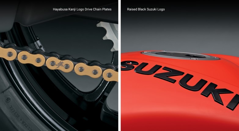 Aλλα μοναδικά στοιχεία της Hayabusa 25th Anniversary είναι: Το επίσης πορτοκαλί κάλυμμα της σέλας συνεπιβάτη, τα επετειακά εμβλήματα και λογότυπα τοποθετημένα στο ρεζερβουάρ, το φέρινγκ και την ουρά.