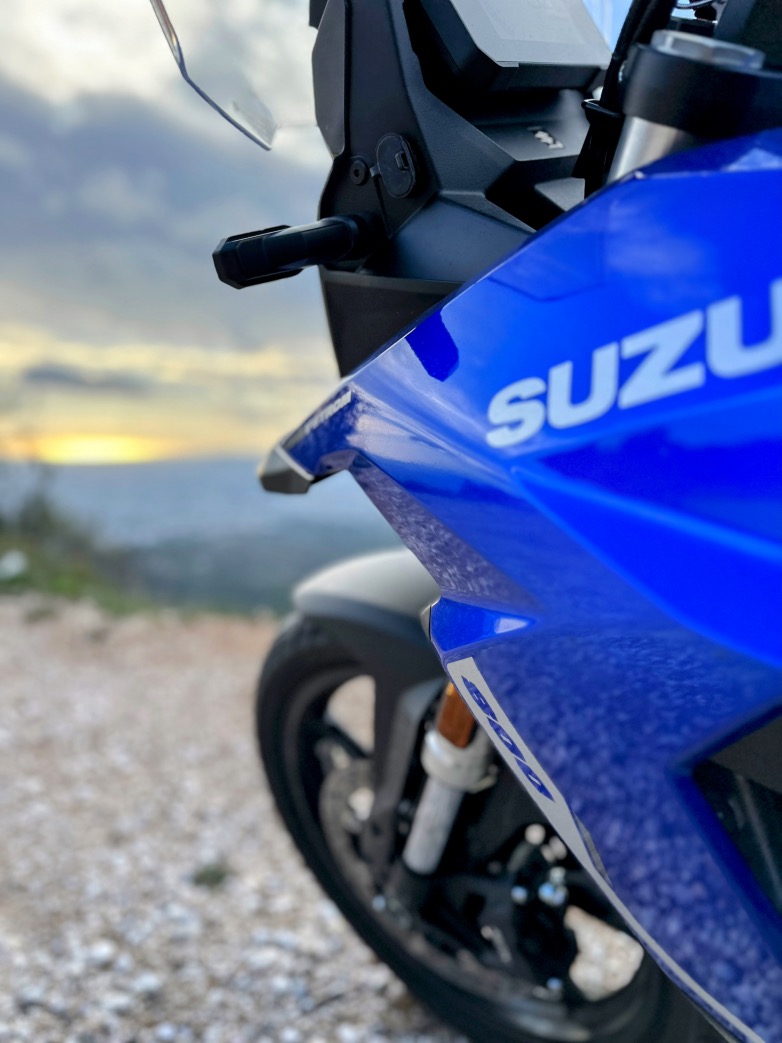Πράγματι και όσο κινηθήκαμε μέσα στην πόλη η V-STORM 800 δεν έδειξε το σχετικά μεγάλο βάρος των 223 κιλών, αλλά αντίθετα είχε μια πιο ανάλαφρη αίσθηση και μπορούσε να ελιχθεί άνετα στην κυκλοφορία, ενώ η αλλαγή ταχυτήτων χωρίς τη χρήση συμπλέκτη είναι κάτι ιδιαίτερα χρήσιμο. Σε δρόμους με στροφές τα ειδικά Dunlop που φοράει ζεστάθηκαν εύκολα και έδωσαν την πρόσφυση που χρειάζεται για να ευχαριστηθείς τα πλαγιάσματα, με ασφάλεια. Η λειτουργία αναρτήσεων και φρένων δεν άφησε κανένα παράπονο και το σύνολο κινήθηκε πολύ άνετα και εύκολα. Σε βατές ομαλές χωμάτινες διαδρομές επίσης δεν έδειξε κανένα πρόβλημα, χωρίς να έχει με αυτά τα λάστιχα απαιτήσεις για σκαρφάλωμα σε δύσκολα χώματα. Τέλος στο ταξίδι η προστασία από το φέρινγκ και η πιο άνετη θέση σε σχέση με την DE (παρά το ότι ο οδηγός είναι ελάχιστο πιο σκυμμένος μπροστά και τα μαρπσιέ είναι λίγο ψηλότερα τοποθετημένα), δίνουν τη δυνατότητα να κάνεις πολλά χιλιόμετρα χωρίς κόπο.