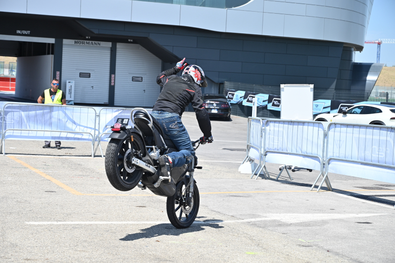 Ο γνωστός οδηγός αγώνων του Παγκοσμίου Πρωταθλήματος Moto E και δάσκαλος της Ιταλικής Ομοσπονδίας Μοτοσυκλέτας, ο Massimo Roccoli ήταν σε ρόλο πλοηγού μαζί μας, για τον πρώτο γύρο στην πίστα και μετά ο κάθε δημοσιογράφος μπορούσε να δοκιμάσει για τρεις γύρους το ηλεκτρικό μοντέλο και μετά για ακόμη τρεις το θερμικό.