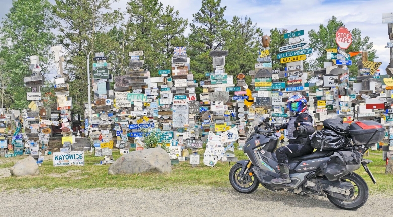 Οι καιρικές συνθήκες ήταν άστατες καθοδόν, ενώ υπήρξαν και δύο απαραίτητες στάσεις στη διαδρομή μου: η πρώτη στην κωμόπολη Watson Lake, όπου επισκέφθηκα ένα δάσος με… πινακίδες! Ήταν το “Sign Post Forest”, ένα τουριστικό αξιοθέατο-πάρκο με περίπου 80.000 απίθανες πινακίδες απ’ όλο τον κόσμο…