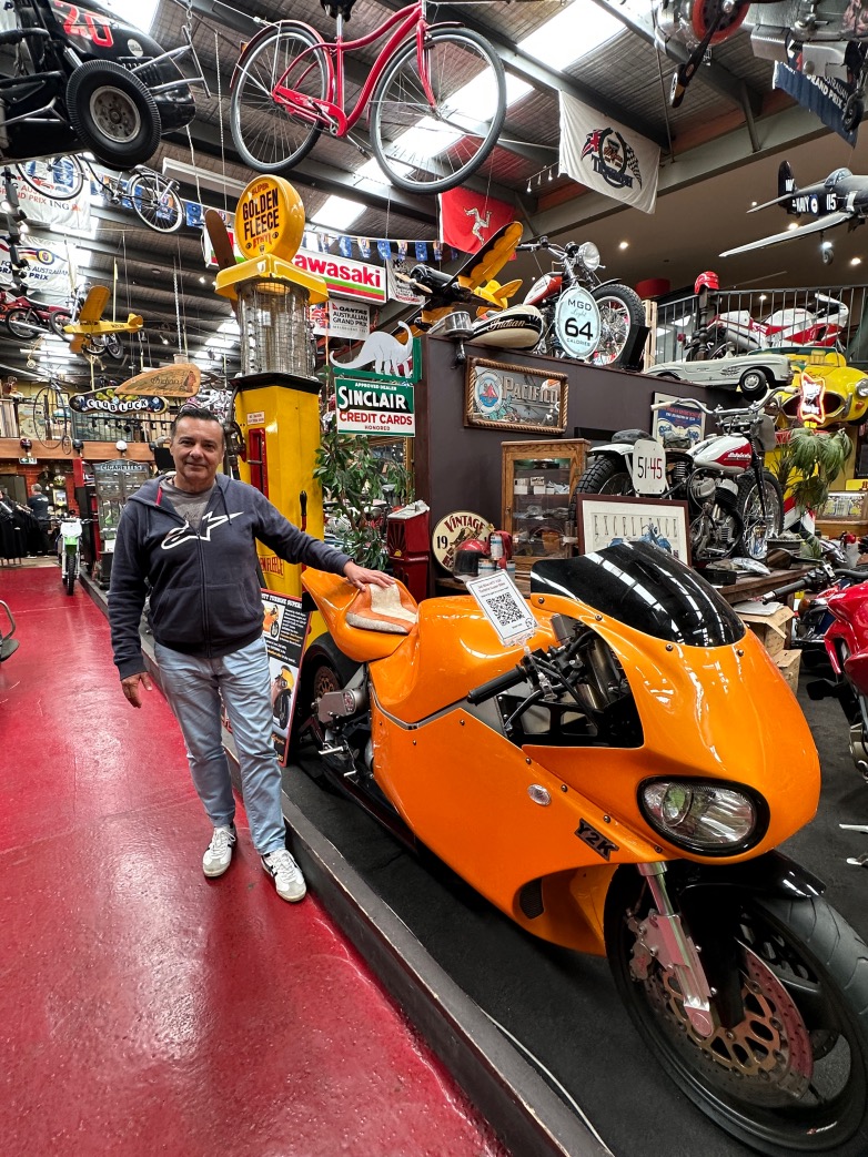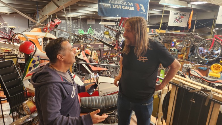Λίγο αργότερα ο Χριστόδουλος αντί να φέρει τους καφέδες, έφερε να μου γνωρίσει έναν ψηλό με μακριά ξανθά μαλλιά που ήταν πολύ οικείος με το χώρο, όπως έδειχνε η σιγουριά στα βήματά και στο βλέμμα του ανάμεσα σε τέτοια εκθέματα. Ο Johnny Gee είναι ο εμπνευστής, δημιουργός και ιδιοκτήτης του χώρου αυτού που ξεκίνησε ως ένα μικρό συνεργείο μοτοσυκλέτας το 1988, για να γίνει τα τελευταία 30 χρόνια το μεγαλύτερο Μουσείο Κλασικών Μοτοσυκλετών της Αυστραλίας.