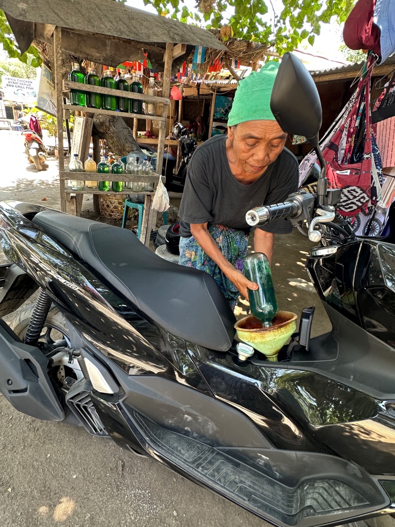 Φυσικά σε αυτά τα βενζινάδικα – που λειτουργούν νόμιμα – τα μέτρα ασφαλείας είναι ανύπαρκτα, δεν υπάρχουν πυροσβεστήρες και είναι δίπλα σε εύφλεκτα υλικά, όπως τα ρούχα της κυρίας που γέμισε το ρεζερβουάρ της ολοκαίνουργιας Honda PCX 160 που είχαμε για τις μετακινήσεις μας αυτές τις ημέρες του GP της Ινδονησίας.