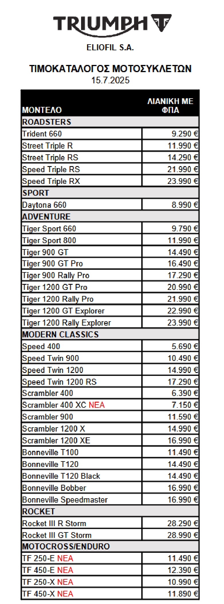 H Triumph Motorcycles ανακοίνωσε τις τιμές για τις νέες αγωνιστικές motocross TF 250-X και TF 450-X και τις αντίστοιχες αγωνιστικές enduro TF 250-E και TF 450-E.