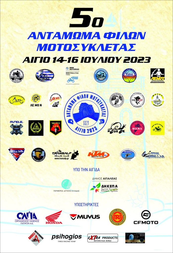 Οι απανταχού μοτοσυκλετιστές ζεσταίνουν τους κινητήρες τους για το 5ο ετήσιο Αντάμωμα Φίλων Μοτοσυκλέτας, που θα πραγματοποιηθεί στο Αίγιο, το μπαλκόνι του Κορινθιακού, από 14 έως και 16 Ιουλίου 2023. Σκοπός της εκδήλωσης και εφέτος είναι όλοι οι μοτοσυκλετιστές που θα συμμετάσχουν να διασκεδάσουν, να βολτάρουν, να ενημερωθούν, να δουν ξανά φίλους και γνωστούς από όλη την Ελλάδα και να γυρίσουν σπίτια τους ασφαλείς και ευχαριστημένοι. To Αντάμωμα Φίλων Μοτοσυκλέτας είναι ανοικτό σε όλους τους μοτοσυκλετιστές, οι ενδιαφερόμενοι μπορούν να συμμετέχουν είτε ατομικά είτε οργανωμένα, σαν ομάδα ή λέσχη.