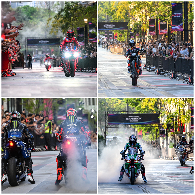Με μοτοσυκλέτες δρόμου της κάθε εταιρίας, κάθε αναβάτης έφτασε στην σκηνή κάνοντας έναν γύρο γύρω από το τετράγωνο και μέσα στον κύριο χώρο του ONE Bangkok. Ο στόχος: κάντε ό,τι θέλετε και δημιουργήστε όσο θόρυβο μπορείτε. Σίγουρα ο Fabio Quartararo (Monster Energy Yamaha MotoGP) το πήγε σε άλλο επίπεδο, κάνοντας όχι μόνο ένα αλλά αρκετά burnouts. Και τότε, τον ανταγωνίστηκε με αξιώσεις και ο Jack Miller (Prima Pramac Racing). Βέβαια και οι δύο οδηγούσαν Yamaha R1, που είχε εξοπλιστεί με ανάλογες εξατμίσεις! Και μετά…