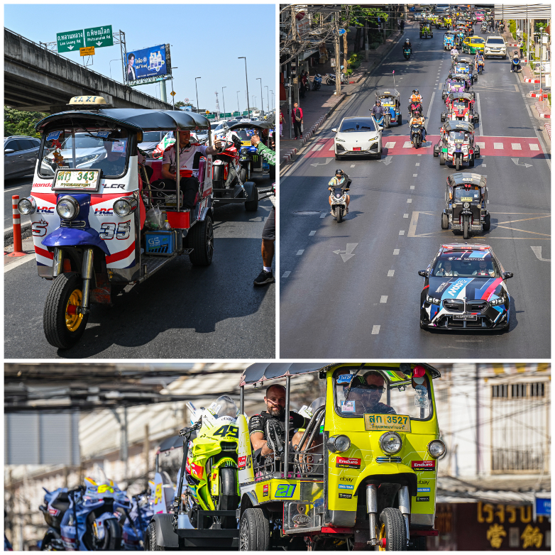 Οι μοτοσυκλέτες έκαναν και αυτές την εμφάνισή τους με στυλ – πάνω σε τουκ-τουκ και συνοδευόμενες από το νέο BMW M Safety Car. Διασχίζοντας τους δρόμους της Μπανγκόκ, η πομπή ανακοίνωσε την άφιξη του MotoGP και αποτέλεσε την τέλεια προετοιμασία για την τελική άφιξη των μοτοσυκλετών στο ναό για τη φωτογράφιση.