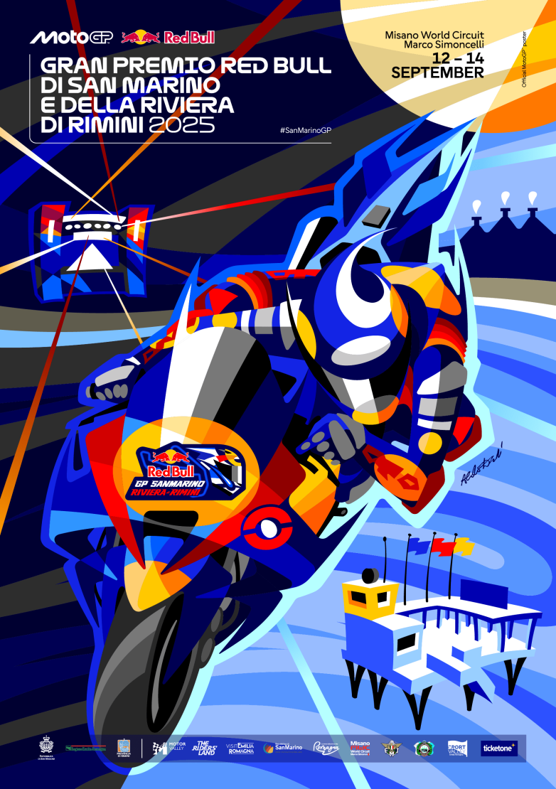 Το πόστερ, με την υπογραφή του Aldo Drudi και της Drudi Performance, θέλει να αποτυπώσει ακριβώς αυτό: την τεράστια γκάμα εμπειριών που προσφέρει το γεγονός, όχι μόνο μέσα στο Misano World Circuit, αλλά και σε ολόκληρη την Riviera και την Repubblica di San Marino.