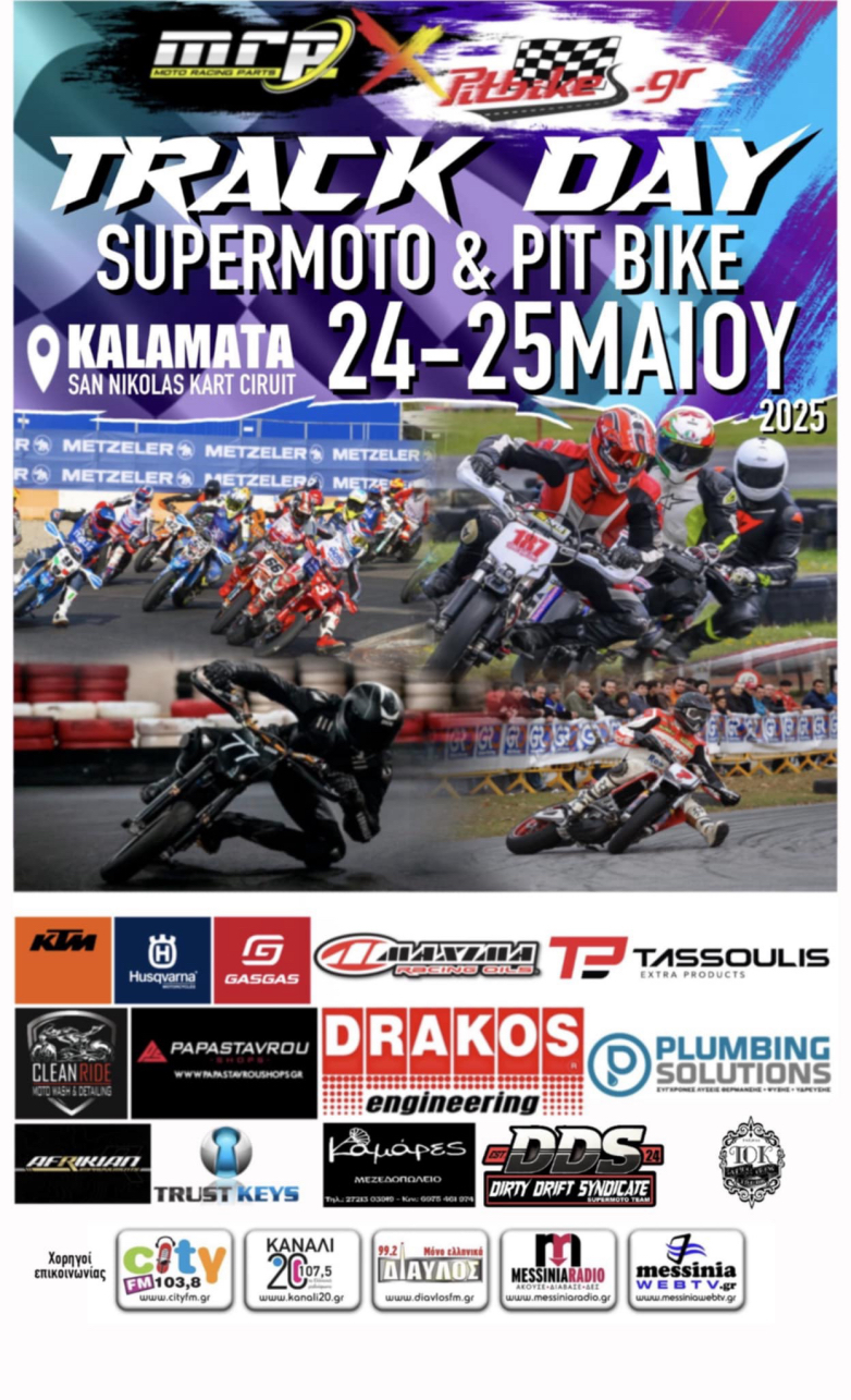 Τρέξε στην πίστα και όχι στο δρόμο! Το PitbikesGr και η mrp-Moto Racing Parts μας προσκαλούν σε ένα συναρπαστικό διήμερο Track Day στην Πίστα Καρτ San Nicolas, στην πανέμορφη Καλαμάτα, με θέαμα από Supermoto και Pitbikes, στις 24-25 Μαΐου 2025.