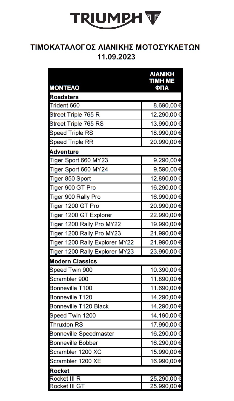 H Triumph Motorcycles έδωσε στη δημοσιότητα τον ανανεωμένο τιμοκατάλογο λιανικής μοτοσυκλετών που ισχύει από τις 11 Σεπτεμβρίου 2023.