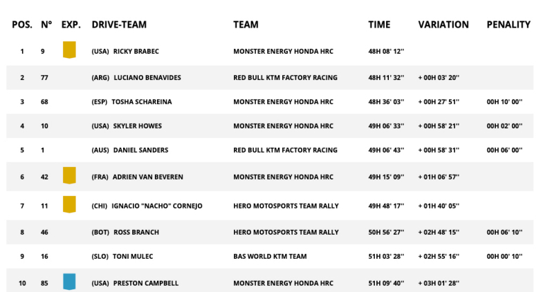 Η πιθανότητα αντεπίθεσης του Luciano Benavides στην τελευταία Ειδική δεν μπορεί να αποκλειστεί πλήρως. Ο αδελφός του Kevin το είχε καταφέρει το 2023, αλλά τότε βρισκόταν μόλις 12” δευτερόλεπτα πίσω από τον Toby Price. Αύριο, ο Αργεντινός θα ξεκινήσει 3 λεπτά πίσω από τον νέο επικεφαλής, όμως θα έχει στη διάθεσή του μόνο 105 χιλιόμετρα για να καλύψει τη διαφορά, σε μια απόσταση όπου ο Brabec θα εισπράξει και τα μπόνους του «ανοίγοντα» (έως 1’23’’ συνολικά). Συνεπώς, ο αναβάτης της Red Bull KTM Factory Racing θα χρειαστεί να κινηθεί… υπερηχητικά (να βγάλει φτερά με το ενεργειακό ποτό που είναι χορηγός της δικής του ομάδας) για να ανατρέψει τη Γενική Κατάταξη.