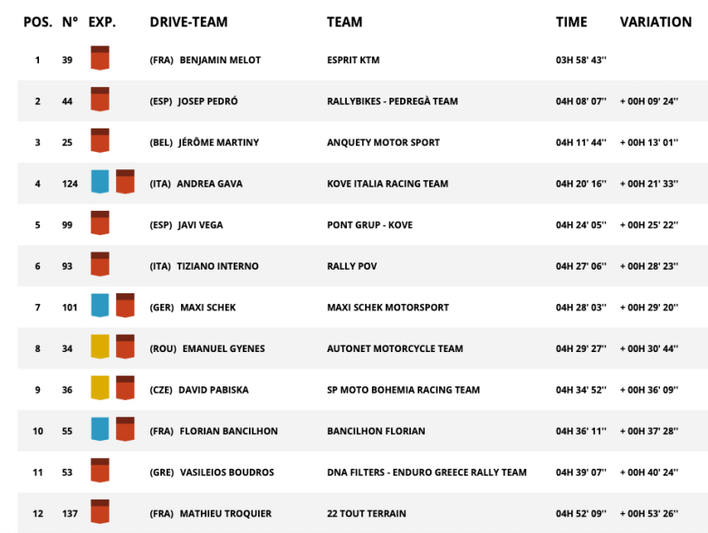 Στην κατηγορία Original by Motul, στην οποία διαγωνίζεται ο Βασίλης Μπούδρος, ο Γάλλος Benjamin Melot με ΚΤΜ έμεινε στην πρώτη θέση στη Γενική Κατάταξη της κατηγορίας, με νίκη στην Ειδική και τη διαφορά να αυξάνεται στα 19′ λεπτά από τον Josep Pedro με Husqvarna.