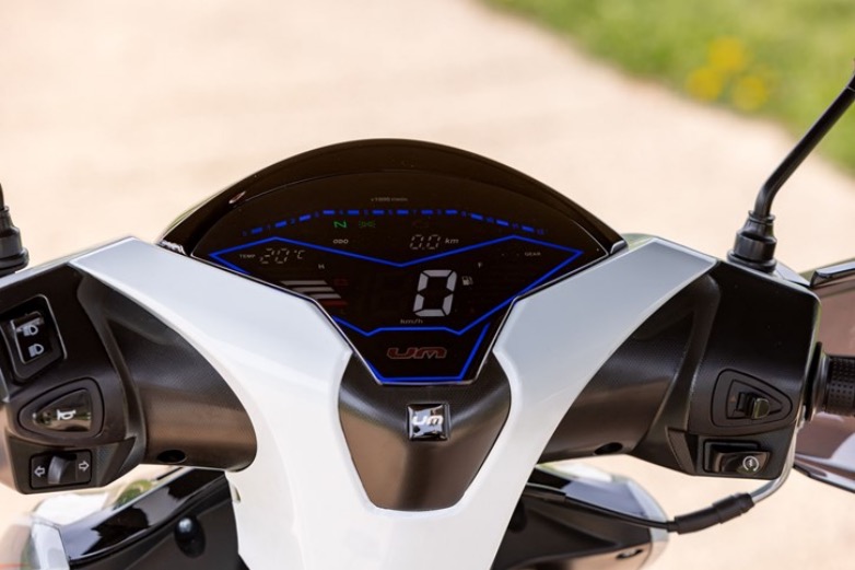Το παπί της UM εφοδιάζεται με μεγάλους τροχούς 17’’, με φώτα LED περιφερειακά, που συμβάλλουν στην ασφάλεια των μετακινήσεων, ενώ εξοπλίζεται με σχάρα πίσω αλλά και με σχάρα τοποθέτησης αντικειμένων στην «ποδιά» του.