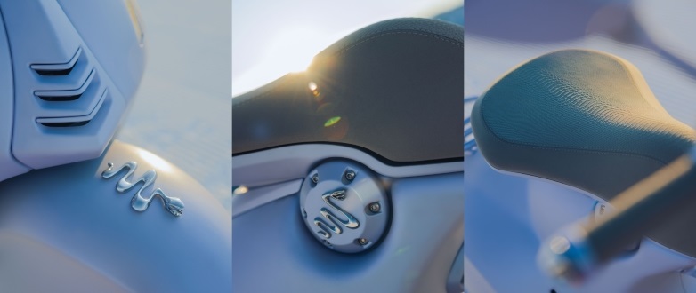 Σε αυτή την αρμονική συγχώνευση κομψότητας και παγετώδους τοπίου προστίθεται η έμπνευση του φιδιού, το οποίο βρίσκει έκφραση στις χειρολαβές και τη σέλα, με επένδυση που θυμίζει την απαλή υφή του δέρματος του ζώου.