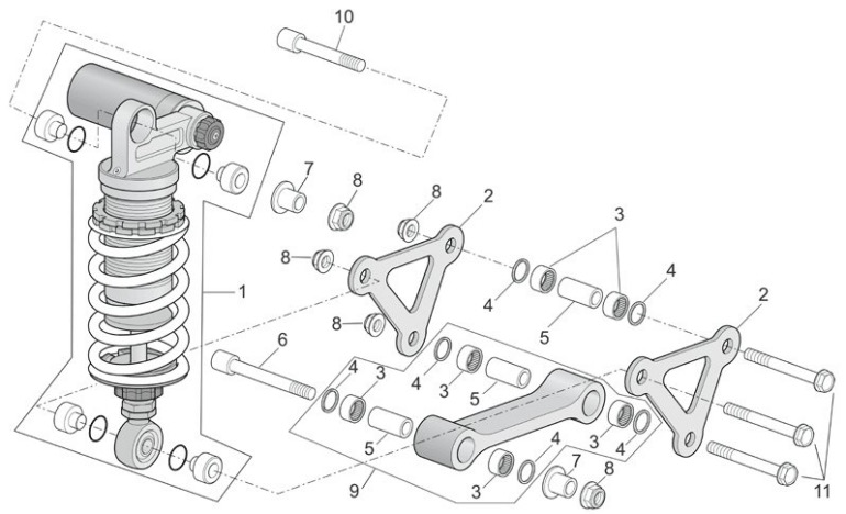 Υπάρχουν όμως και περιπτώσεις όπου το μοχλικό δεν χρησιμοποιείται και η έδραση του αμορτισέρ γίνεται απευθείας στο ψαλίδι με μία μόνο σύνδεση χωρίς κανέναν επιπλέον μοχλό. Αυτή η διάταξη συναντάται και ως επιλογή από τον κατασκευαστή στο σχεδιασμό της πίσω ανάρτησης της Aprilia RS660, η οποία είναι μία μοτοσυκλέτα μεσαίας κατηγορίας supersport και έχει την επιλογή αυτή ως προτέρημα για τη χρήση αυτής της μοτοσυκλέτας που είναι η πίστα, αλλά και η καλή συμπεριφορά στο δρόμο.