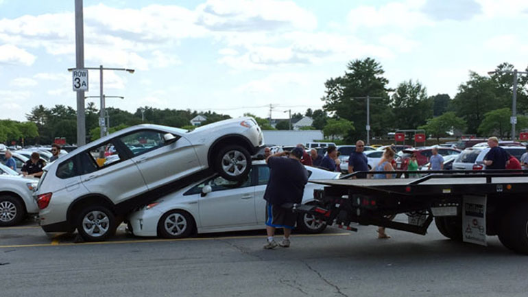 Πανικός επικράτησε σε παρκινγκ στο Middleton της Μασαχουσέτης, όταν μια ηλικιωμένη οδηγός μπέρδεψε το γκάζι με το φρένο, με αποτέλεσμα η BMW X3 να καβαλήσει κυριολεκτικά ένα Prius.
