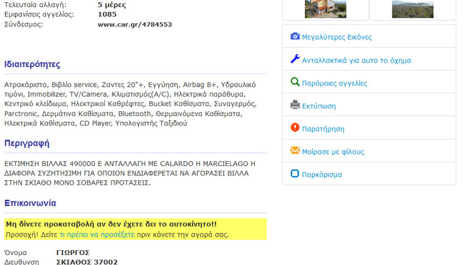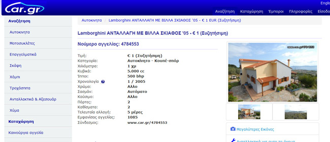 Το όνειρό του να αποκτήσει κάποτε το αυτοκίνητο των ονείρων του θέλει να κάνει ο ιδιοκτήτης μίας βίλας στην Σκιάθο. Για το λόγο αυτό έχει αναρτήσει και αγγελία στο διαδίκτυο και αναφέρει πως το σπίτι που βρίσκεται στην κατοχή του αξίας 490.000 ευρώ το δίνει για… χάρη μιας Murcielago ή Gallardo…