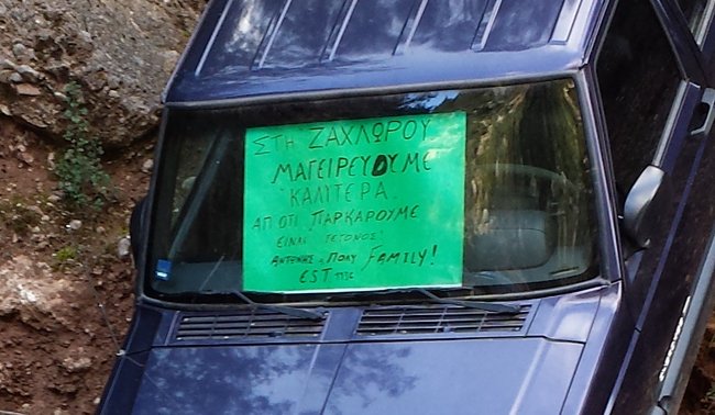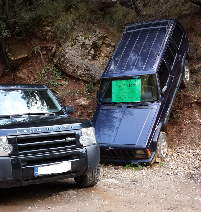 Ένα πρωτότυπο τρόπο βρήκαν οι κάτοικοι του χωριού Ζαχλωρού στα Καλάβρυτα για να διαφημίσουν στους επισκέπτες την ποιότητα του φαγητού που έχουν οι ταβένρες του χωριού. Τοποθέτησαν ένα Jeep Cherokee σχεδόν κάθετα σε ένα χώρο στάθμευσης και έγραψαν πάνω σε αυτό: