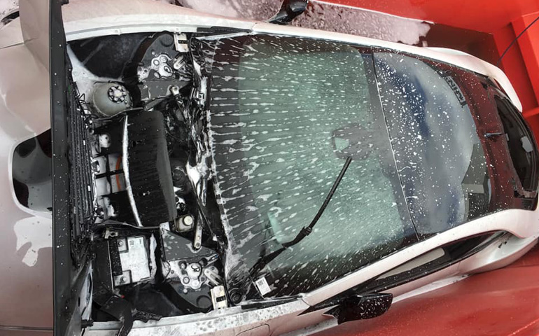 Ωστόσο, επειδή οι μπαταρίες των ηλεκτροκίνητων και plug-in hybrid οχημάτων μπορεί να αναφλεγούν οποιαδήποτε στιγμή, αποφάσισαν να προβούν σε πιο δραστικές λύσεις. Έτσι, έβαλαν το sportcar μέσα σε έναν κάδο γεμάτο με νερό και ειδικό υγρό.