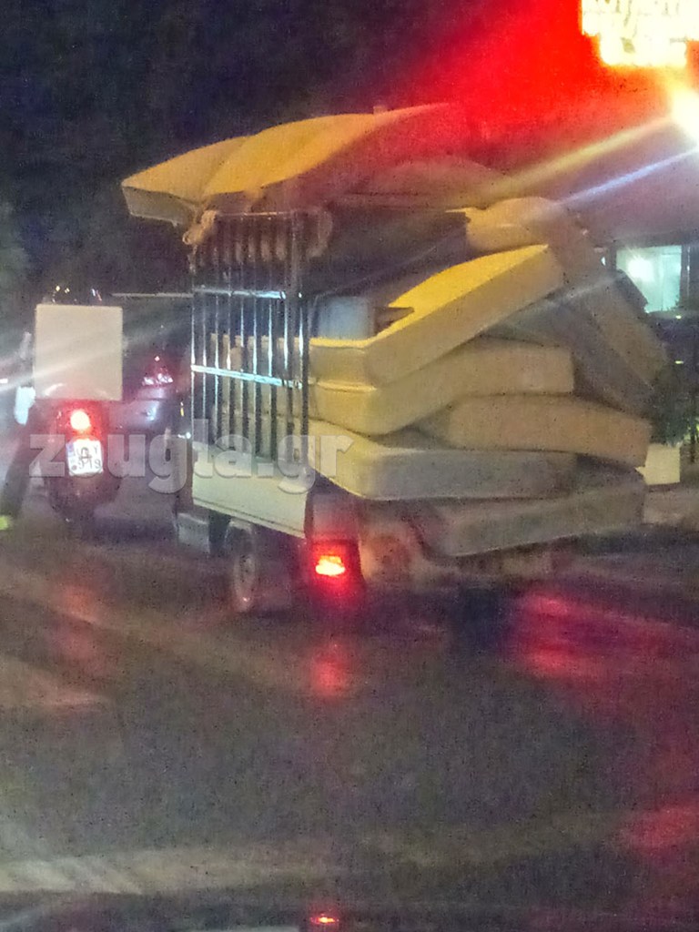 Τη φωτογραφία μας την έστειλε αναγνώστης του zougla.gr, αναφέροντας ότι λήφθηκε στις 11 το βράδυ της Τρίτης, στην περιοχή της Καλλιθέας. «Που είναι η αστυνομία να τον σταματήσει», αναρωτιέται στο μήνυμά του ο αναγνώστης, για τον οδηγό ο οποίος προκειμένου να γλιτώσει κάποια δρομολόγια, υπερφόρτωσε με στρώματα το τρίκυκλο του αδιαφορώντας για τους πιο βασικούς κανόνες ασφαλείας…
