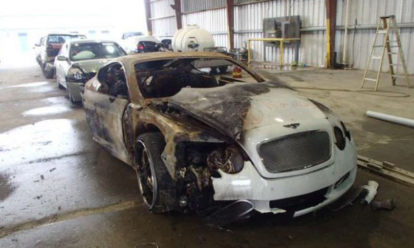 Μια καμένη Bentley Continental GT, βγήκε σε δημοπρασία από τον οίκο Salvage Autos Auction, στο Λος Άντζελες, για 56.657 δολάρια. Το αυτοκίνητο έχει καταστραφεί σχεδόν ολοκληρωτικά, αφού η φωτιά έχει λιώσει κάθε τμήμα, ακόμα και τον W12 6.0 λίτρων κινητήρα.