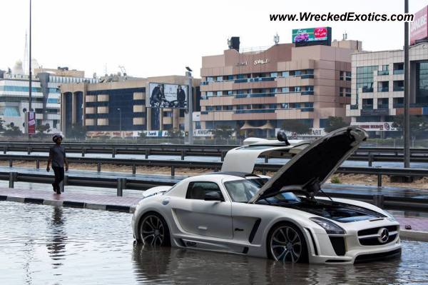 Αντίθετη άποψη φαίνεται πως είχε ο ιδιοκτήτης μίας Mercedes SLS AMG ο οποίος στην προσπάθειά του να διασχίσει έναν πλημυρισμένο δρόμο “κόλλησε” με το πανάκριβο αυτοκίνητο. Ο ίδιος μπορεί να μην έπαθε τίποτα (άντε το πολύ λίγο να… βράχηκε) αλλά σίγουρα το αυτοκίνητο του θα χρειαστεί… επισκευή!