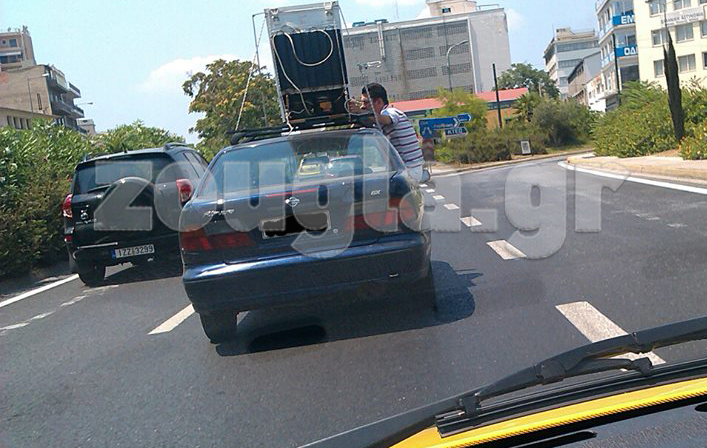 Όπως μπορείτε να δείτε από την φωτογραφία που μας έστειλε ο Θ.Ρ. ο συνοδηγός ενός αυτοκινήτου έχει βγει από το παράθυρο για να κρατά το ψυγείο που βρίσκεται δεμένο στην οροφή!!! Τα σχόλια απλά είναι περιττά…