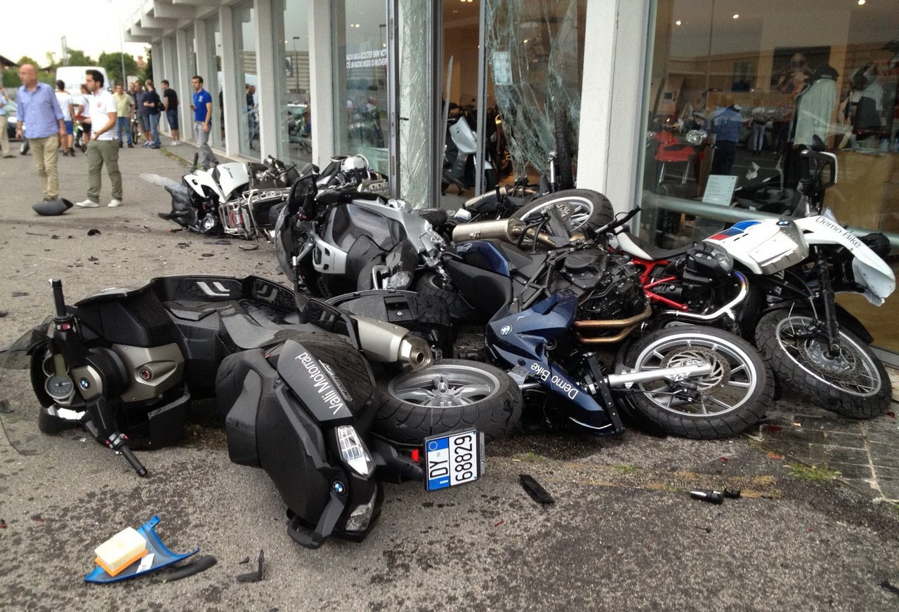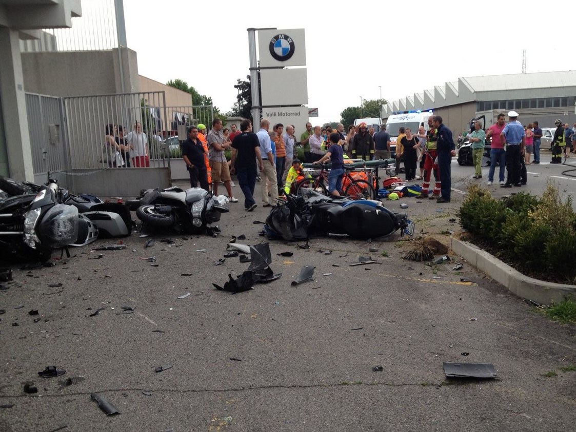Το ατύχημα συνέβη μπροστά σε μία αντιπροσωπεία της BMW και, όπως θα δείτε στις φωτογραφίες, όλες οι μηχανές καταστράφηκαν ολοσχερώς. Δυστυχώς, από τη σύγκρουση τραυματίστηκαν και δύο διερχόμενοι ποδηλάτες, οι οποίοι μεταφέρθηκαν στο νοσοκομείο.