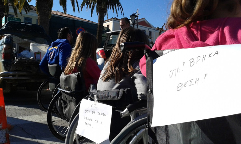 Αναπηρικά αμαξίδια στάθμευσαν… παράνομα σε διάφορα σημεία της πόλης, έχοντας στο πίσω μέρος της πλάτης σημειώματα με φράσεις όπως: «επιστρέφω σε λίγο», «σε 5 λεπτά θα φύγω» κ.α.