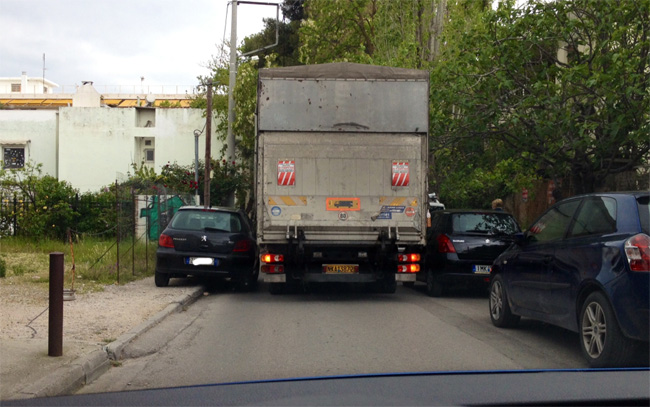 «Ο ανεγκέφαλος οδηγός στα αριστερά έχει παρκάρει παράνομα καβαλώντας το πεζοδρόμιο με αποτέλεσμα το φορτηγό να μην χωράει να περάσει. Μετά από 30 λεπτά και με χίλια μπρος-πισω το φορτηγό πέρασε αλλά είχε σχηματιστεί μεγάλη ουρά και κίνηση»!