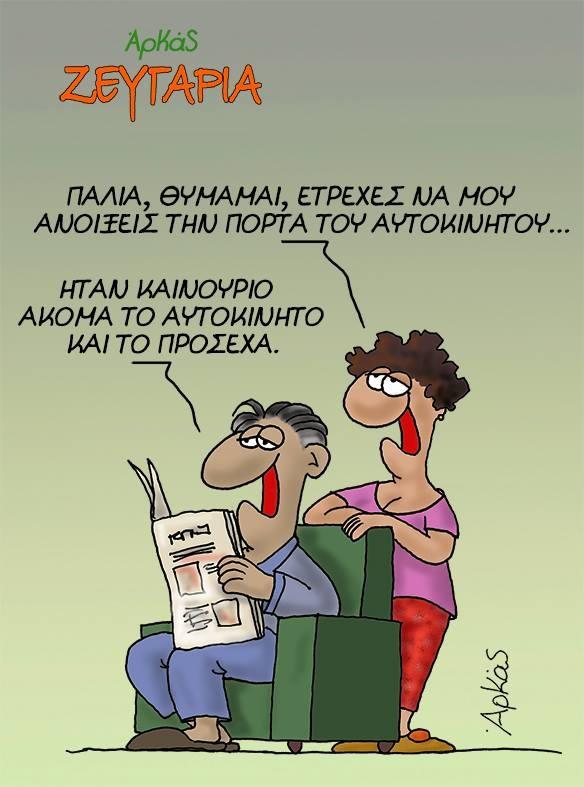 Πρόσφατα στη σελίδα του στο Facebook ανέβασε μία ακόμα πετυχημένη γελοιογραφία που θα μπορούσαμε να πούμε ότι δεν απέχει και πολύ από την πραγματικότητα, ιδίως γι’ αυτούς που έχουν ιδιαίτερη αδυναμία στο αυτοκίνητό τους…