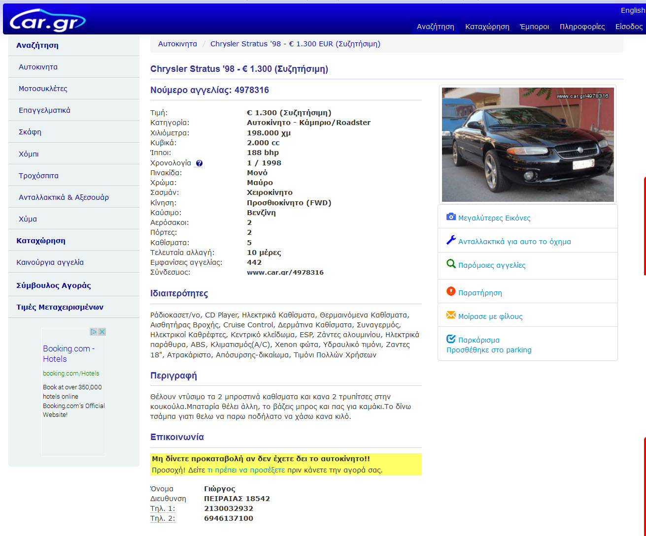 Στις αγγελίες μεταχειρισμένων αυτοκινήτων μπορείς να βρεις αυτό που ψάχνεις. Ρίχνοντας μία ματιά σε αυτές το… μάτι μας έπεσε σε ένα Chrysler Stratus του 1998.