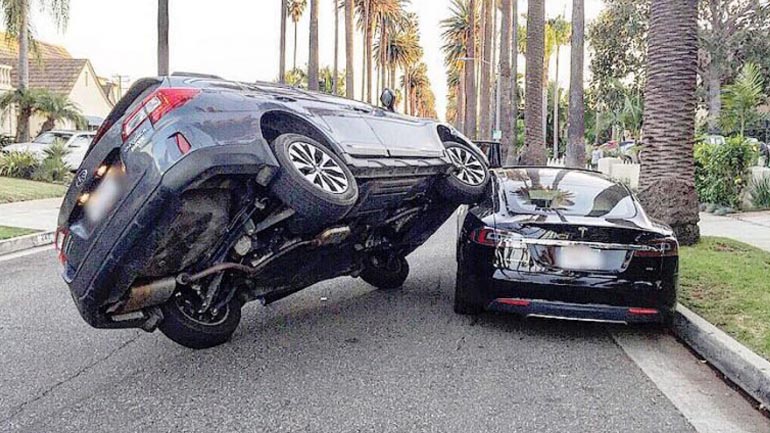 Ένα απίστευτο ατύχημα σημειώθηκε σε κεντρικό δρόμο του Μπέβερλι Χιλς, όταν ο οδηγός ενός Subaru Outback έχασε τον έλεγχο του οχήματος και αυτό «σκαρφάλωσε» στην οροφή ενός Tesla.