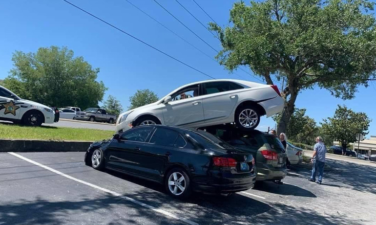 Το αυτοκίνητο έφυγε με ορμή προς τα πίσω, διένυσε μία μεγάλη απόσταση με την όπισθεν, πέρασε από τον κυκλικό κόμβο, συνέχισε την ανεξέλεγκτη πορεία του και κατέληξε πάνω σε δύο αυτοκίνητα που ήταν σταθμευμένα σε υπαίθριο πάρκινγκ