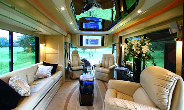 Το εσωτερικό είναι 46 τ.μ. και διαθέτει ένα δωμάτιο-σουίτα, μπάνιο, σαλόνι και κουζίνα. Το αυτοκινούμενο-παλάτι, προσφέρεται την ημέρα προς 9.700 ευρώ και στην τιμή περιλαμβάνεται ένας βραβευμένος με αστέρι Michelin σεφ, προσωπικό για σέρβις και οδηγός.